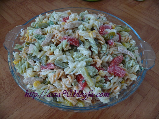 پاستا و سس و ذرت و جعفری رو مخلوط کنید.اگه عجله دارید بذارید توی فریزر و گرنه به مدت یک ساعت داخل یخجال بگذارید تا سس کاملا به خورد پاستا بره.