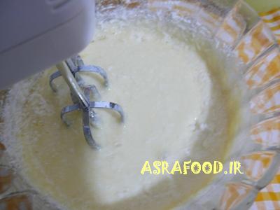 آرد رو مثل همیشه به همراه بکینگ پودر سه بار الک کنید، بعد داخل کیک هم در سه مرحله آرد رو الک کنید و هر بار چند دور با همزن بزنید تا مخلوط بشه، البته نباید زیاد هم زده بشه فقط در حدی که مخلوط بشه.